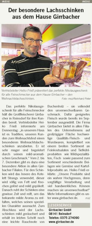 Das perfekte Nikolausgeschenk für alle Feinschmecker hält die Großfleischerei Girrbacher in Reinsdorf für ihre Kunden bereit. Vertriebsleiter Heiko Frieß informierte am Donnerstag: „in unserem Haus ist es Tradition, unseren Kunden zum Weihnachtsfest einen besonderen Weihnachtslachsschinken anzubieten. Er ist sehr mager und begeistert durch seinen mild-aromatischen Geschmack.“ Vom 2. bis 7. Dezember gibt es dazu eine besondere Aktion in allen Girrbacher Filialen. Für den Schinken wird das Innere des Kotelett Strangs verwendet, dieser wird völlig von Fett und Knochen gelöst und mild gepökelt. Danach ruht der Schinken eine gewisse Zeit und reift, um das bekannte milde Aroma zu entfalten, welches seinen speziellen Charakter ausmacht. Zum Abschluss wird der Lachsschinken mild geräuchert und erhält im letzten Schritt noch eine leichte Rauchnote von Buchenholz – sie vollendet den unverwechselbaren Geschmack. Dafür geeignetes Fleisch wurde bereits im September ausgewählt. Die Firma Girrbacher bietet in allen Filialen des Unternehmens auf großzügiger Fläche hochwertige Qualitäts-Fleisch- und Wurstwaren, komplettiert von einem breiten Sortiment an Feinkostsalaten und Tiefkühlprodukten wie Wildspezialitäten, Fisch sowie passend zum Sortiment verschiedenste Beilagen wie Gemüse und Kartoffelprodukte an. Heiko Frieß erklärte: „Unsere Produkte sind ein wahrer Hochgenuss, denn sorgfältige Verarbeitung und viel handwerkliches Können machen sie unverwechselbar!“ Mehr Informationen gibt es unter www.girrbacher.de.