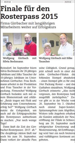 Reinsdorf. Im September feiern Silvia Bochmann ihr 20-jähriges Jubiläum und Silke Tauscher ihr IO-jähriges Jubiläum im Unternehmen Girrbacher. Frau Bochmann arbeitet in der Produktion und Frau Tauscher in der Verpackung. Firmenchef Wolfgang Girrbach bedankte sich mit einem Blumenstrauß und erklärte: "Beide tragen mit Fleiß und Erfahrung zum Unternehmenserfolg bei" Wolfgang Girrbach nutzte die Gelegenheit, um auch auf die Erfolgsgeschichte des Rosterpasses aufmerksam zu machen: "Nur noch wenige Tage! Dann läuft die Zeit des Girracher-Rosterpasses 2015 ab."Die diesjährige Aktion läuft nur noch bis zum 30. September. Dann verliert der aktuelle Pass seine Gülltigkeit. Grund genug jetzt schnell noch in einer der zehn Girrbacher-Filialen die fehlenden Stempel abzuholen - Einen Stempel gibt es fü eine 10er Packung Roster - und das Guthaben einzulösen. Wolfgang Girrbach erinnerte: "Also nicht vergessen, den Rosterpass bald ausgefüllt zurückgeben."Zuvor gibt es in der Woche vom 28. September bis 3. Oktober noch einmal Super-Sonder-Spitzenangebote zum Abgrillen. Weitere tolle Angebote erhalten die Kunden anlässlich der Neueröffnung der Filiale in Schneeberg am 30. September nach erfolgreicher Erweiterung und Modernisierung. Ab dem Eröffnungstag wird hier ein noch breiteres und vielfätigeres Sortiment angeboten.