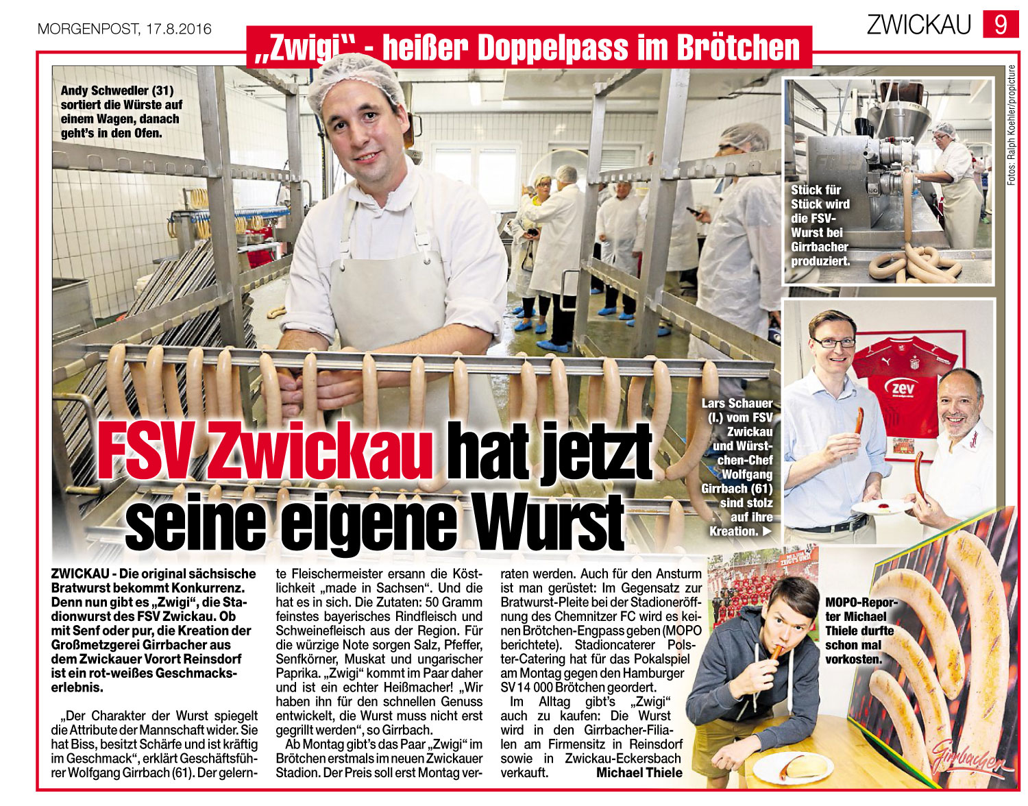 „Der Charakter der Wurst spiegelt die Attribute der Mannschaft wider. Sie hat Biss, besitzt Schärfe und ist kräftig im Geschmack“, erklärt Geschäftsführer Wolfgang Girrbach (61). Der gelernte Fleischermeister ersann die Köstlichkeit „made in Sachsen“. Und die hat es in sich. Die Zutaten: 50 Gramm feinstes bayerisches Rindfleisch und Schweinefleisch aus der Region. Für die würzige Note sorgen Salz, Pfeffer, Senfkörner, Muskat und ungarischer Paprika. „Zwigi“ kommt im Paar daher und ist ein echter Heißmacher! „Wir haben ihn für den schnellen Genuss entwickelt, die Wurst muss nicht erst gegrillt werden“, so Girrbach. Ab Montag gibt’s das Paar „Zwigi“ im Brötchen erstmals im neuen Zwickauer Stadion. Der Preis soll erst Montag verraten werden. Auch für den Ansturm ist man gerüstet: Im Gegensatz zur Bratwurst-Pleite bei der Stadioneröffnung des Chemnitzer FC wird es keinen Brötchen-Engpass geben (MOPO berichtete). Stadioncaterer Polster- Catering hat für das Pokalspiel am Montag gegen den Hamburger SV 14 000 Brötchen geordert. Im Alltag gibt’s „Zwigi“ auch zu kaufen: Die Wurst wird in den Girrbacher-Filialen am Firmensitz in Reinsdorf sowie in Zwickau-Eckersbach verkauft. Michael Thiele