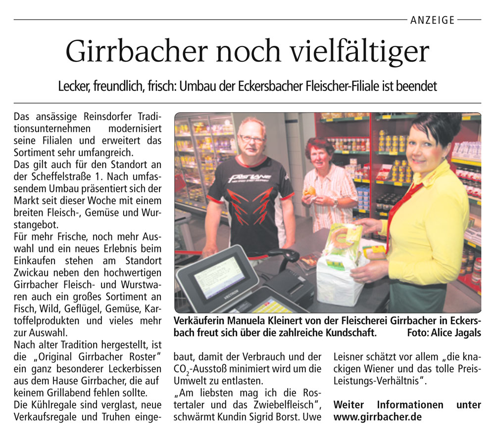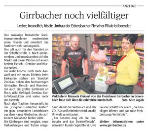 Nach alter Tradition hergestellt, ist die „Original Girrbacher Roster“ ein ganz besonderer Leckerbissen aus dem Hause Girrbacher, die auf keinem Grillabend fehlen sollte. Die Kühlregale sind verglast, neue Verkaufsregale und Truhen eingebaut, damit der Verbrauch und der CO2-Ausstoß minimiert wird um die Umwelt zu entlasten.