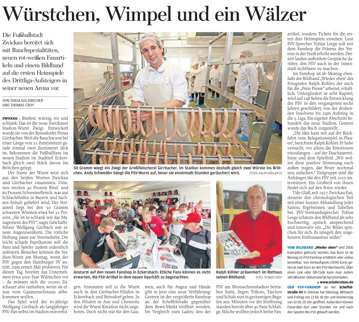 Im Fanshop ist ab Montag ebenfalls der Bildband „Wieder oben“ des Fotografen Ralph Köhler, der auch für die „Freie Presse“ arbeitet, erhältlich. Untergliedert in acht Kapitel, wird auf 148 Seiten die Entwicklung des FSV in den vergangenen sechs Jahren geschildert, von der drohenden Insolvenz bis zum Aufstieg in die 3. Liga. Ein eigener Abschnitt behandelt das neue Stadion. Gestern wurde das Buch vorgestellt.
