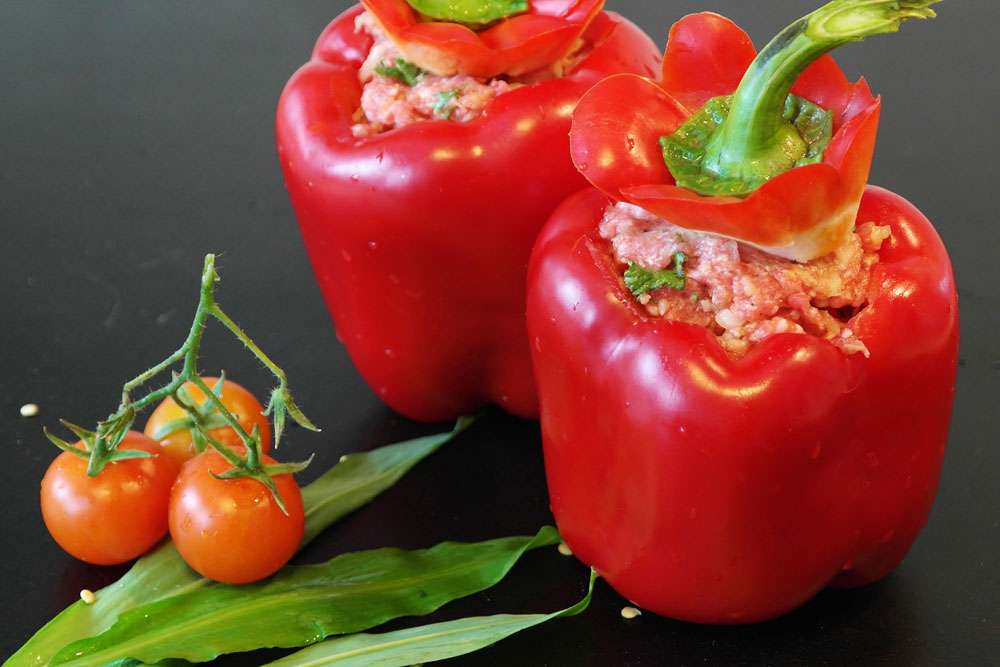 Im Backofen bei etwa 180 Grad ungefähr 20 Minuten backen, bis die Paprika leicht braun ist.