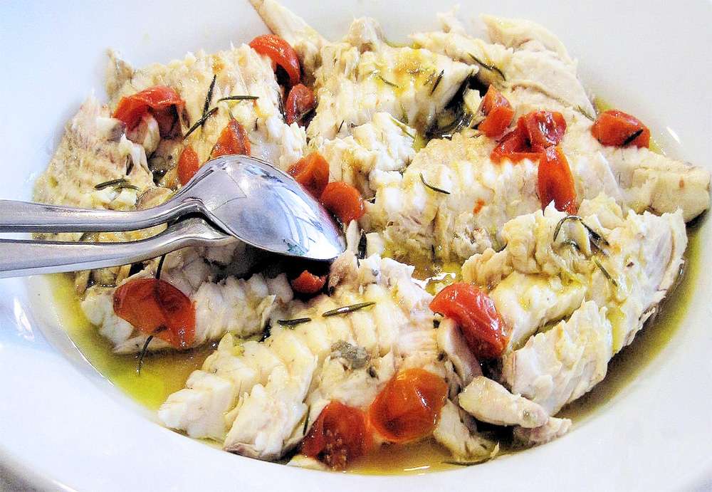 Backofengrill vorheizen. Die Zwiebeln werden geschält und geachtelt. Die Tomaten waschen und halbieren, danach mit den Zwiebeln in eine feuerfeste Form legen. Die Schnittflächen müssen nach oben zeigen. Alles mit etwas Öl einpinseln, salzen und pfeffern. Tomaten und Zwiebeln im Backofen unter dem Grill 5 Min. grillen. Dann den Fisch daneben legen und weitere 6-8 Min. grillen, nach ca. 3-4 Minuten einmal wenden.