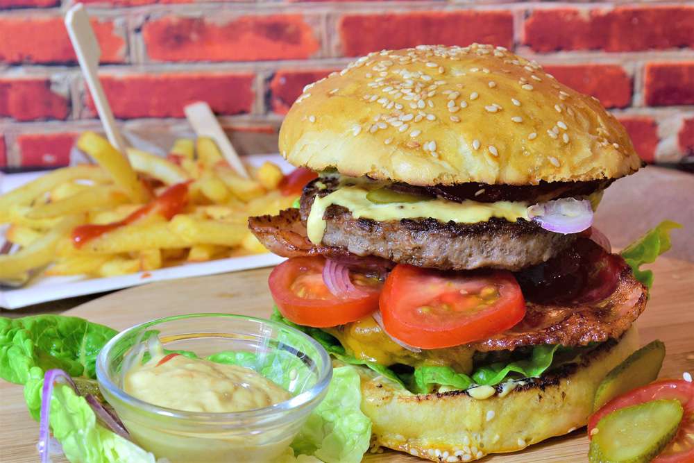 Die Zwiebel schälen und in möglichst feine Ringe schneiden. Die Brötchen halbieren und auf dem heißen Grill ca. 10 Sek. rösten, dabei die Schnittfläche auf den Grillrost drücken. Pattys aus dem Kühlschrank nehmen und mit einem Löffel eine Mulde in die Mitte der Pattys drücken. Die Pattys 3,5 Min. pro Seite auf dem heißen Grill bei direkter starker Hitze und geschlossenem Deckel grillen. Die Brötchenhälften mit Ketchup bestreichen. Salat und Gurke auf die untere Hälfte geben, je einen Patty darauflegen und Tomate und Zwiebeln darauf schichten. Den Burger jeweils mit der oberen Brötchenhälfte schließen.