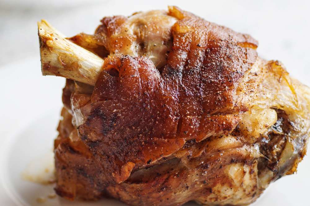 Gelegentlich mit dem Bratensaft begießen und bei Bedarf heißes Wasser nachgießen. Die Haxe soll butterweich sein, das Fleisch muss sich mühelos vom Knochen lösen, dann ist sie genau richtig.