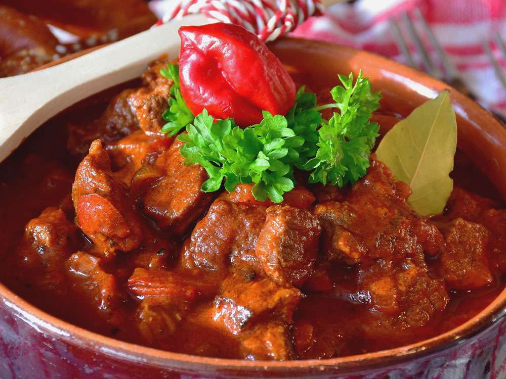 Öl in einem großen Topf stark erhitzen, das Fleisch von allen Seiten kräftig anbraten, dabei salzen und pfeffern. Die Zwiebeln zum Fleisch geben, 3 Min. mitrösten und zugedeckt 5 Min. garen. Anschließend den Deckel abnehmen und die Flüssigkeit verkochen lassen. Paprikapulver und Tomatenmark zugeben, 5 Min mitrösten. Mehl zugeben und unter Rühren 2 Min. mitrösten.