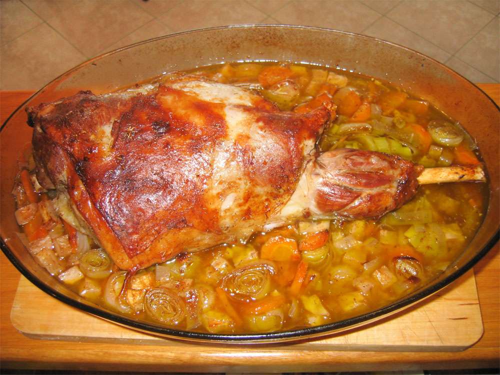 Keule in einen Bräter oder ein tiefes Backblech legen und 15 Min Schmorren lassen. Dann die geschälten und in Spalten geschnittenen Zwiebeln und das geschnittene Gemüse um die Keule herumlegen und im Ofen 15 min weiter braten.