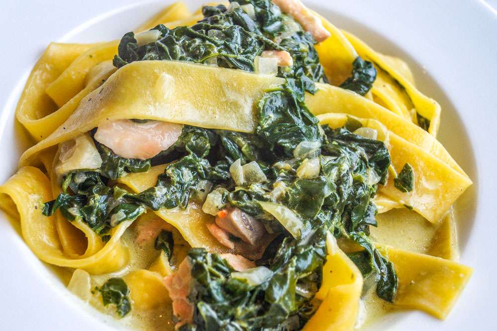Den aufgetauten Lachs in kleine Stücke schneiden und unter die Sauce rühren. Dann nach Belieben würzen (evtl. etwas Weißwein?). Das Gericht nicht allzu lange kochen, da sonst der Fisch verdirbt!