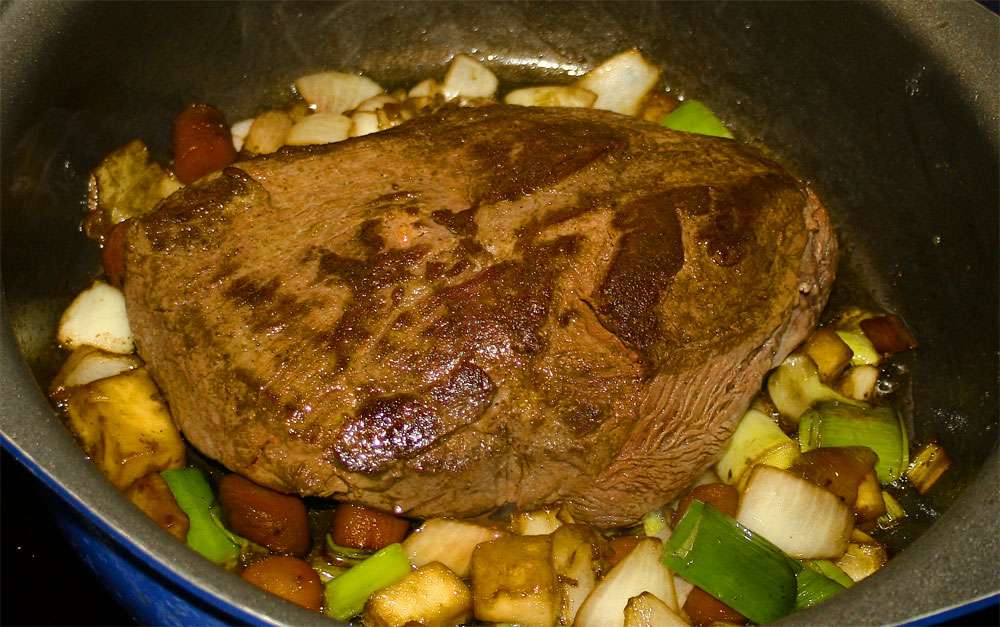 Den Braten bei 190°C abgedeckt 1,5 Stunden in den Backofen geben und schmoren lassen.
