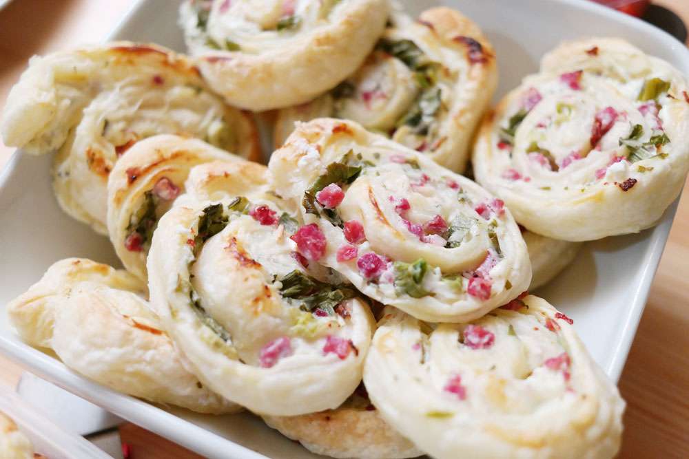 Der Blätterteig wird auf dem Backpapier ausgerollt und der Ananasfrischkäse darauf verstrichen. Ca. 5 cm am schmalen Rand davon freilassen. Mit Zitronenpfeffer bestreuen, Serranoschinken klein schneiden und gleichmäßig darauf auslegen, grob geschnittenes Basilikum darüber verteilen. Jetzt von der schmalen Seite aus fest aufrollen bis zur unbestrichenen Seite und die "Verschlussstelle" mit verquirltem Ei dingfest machen. In das Papier fest einwickeln. Eine halbe Stunde in den Kühlschrank legen.