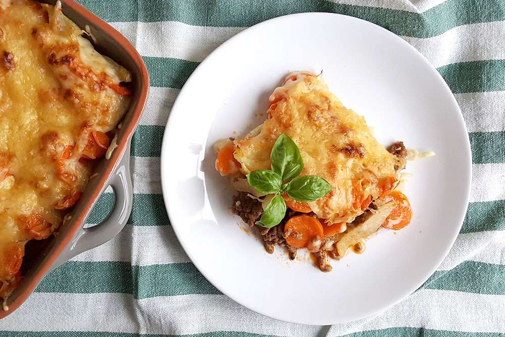 Die Rinderzunge in ca. 1 cm dicke Scheiben schneiden und hintereinander in eine Auflaufform schichten. Dazwischen kommt jeweils ein großer Esslöffel von der Füllung. Die Soße über die Zunge geben und alles bei 200° Unter- und Oberhitze 20-30 Min. überbacken.